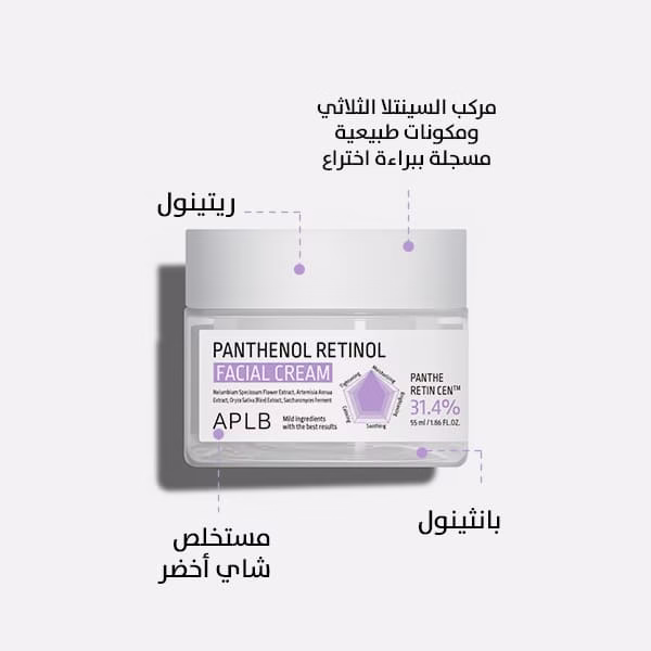 بانثينول (فيتامين B5): ترطيب عميق + خصائص مهدئة للبشرة.
